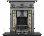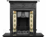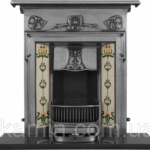 Квіткова деталь каміна з чавуну Morris служить центральним елементом елегантного дизайну в стилі модерн, який доповнюється хитромудрими квітковими деталями на фасонному балдахине і тримачами для плитки всередині каркаса.