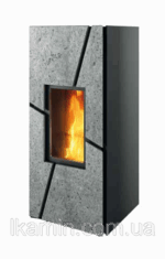 Піч на гранулах без передніх вентиляційних отворів, герметична конструкція з фарбованої сталі, двері зі склом і бічні панелі з серпантину або фарбованої сталі. Чавунний мангал. Інтелектуальне управління згорянням з технологією Maestro. Реалістичне горіння полум’я не відрізняються від горіння дров.
