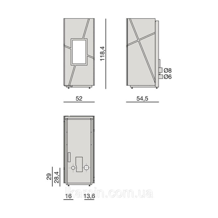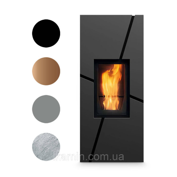 Піч на гранулах без передніх вентиляційних отворів, герметична конструкція з фарбованої сталі, двері зі склом і бічні панелі з серпантину або фарбованої сталі. Чавунний мангал. Інтелектуальне управління згорянням з технологією Maestro. Реалістичне горіння полум’я не відрізняються від горіння дров.