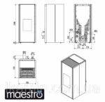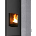 Печь на гранулах без передних вентиляционных отверстий, герметичная конструкция из окрашенной стали, стеклянная входная дверь и боковые панели из серпантина или окрашенной стали. Чугунный мангал. Интеллектуальное управление сгоранием с технологией Maestro.