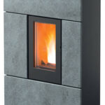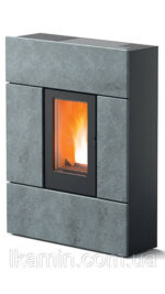 Печь на пеллетах с уменьшенной глубиной (28,6 см). Она доступена с лицевой панелью из камня или, альтернативно, с лицевой керамической панелью белого, бордо или черного цвета.