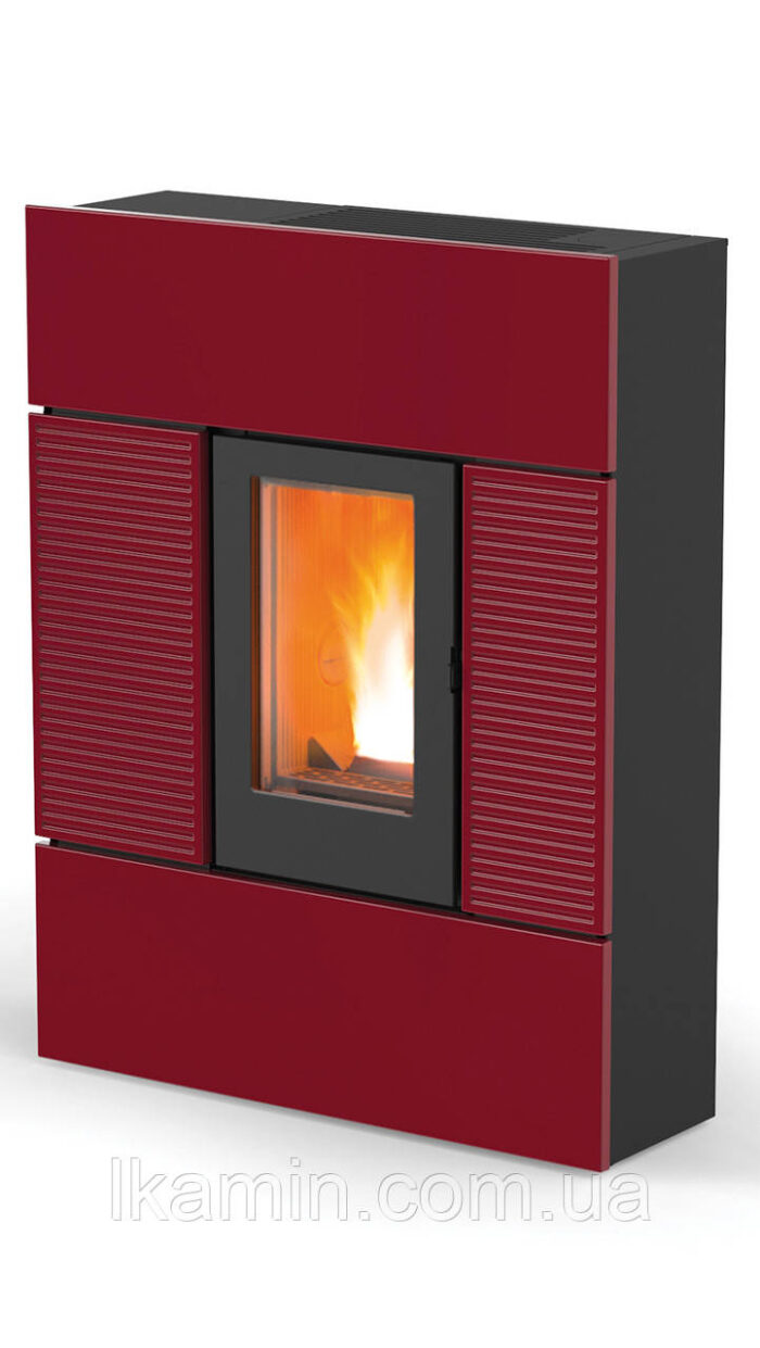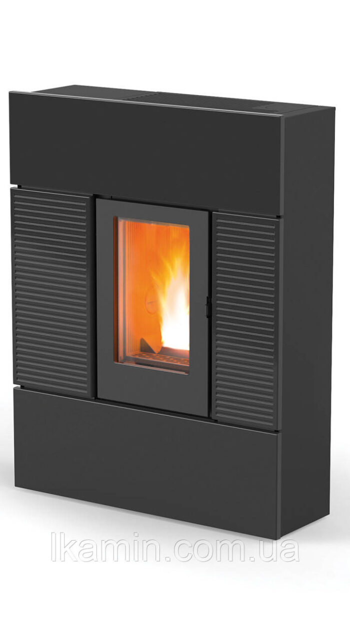 Печь на пеллетах с уменьшенной глубиной (28,6 см). Она доступена с лицевой панелью из камня или, альтернативно, с лицевой керамической панелью белого, бордо или черного цвета.